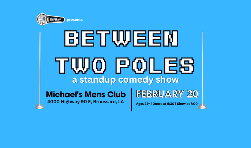 Lafayette Comedy Presents: BETWEEN 2 POLES – A Standup Comedy Show! Michael’s Men's Club | Friday, February 20thTickets: $15 online | $20 cash at the door ($21.26 card/Apple Pay)Ages 21+Showtime: 7:00 PM (Doors open at 6:30 PM) | Ends at 8:30 PMBonus: Comedy show ticket holders can stay for the night!About the Show:"Between 2 Poles" brings together the funniest regional comedians for an unforgettable night of stand-up. Don’t worry—this is a comedy show (yes, your comics will be clothed), but stick around afterward for great food, drinks, and top-tier entertainment!About Michael’s Men’s Club:The best in Women, Food & Fun since 2001! Whether out for a night of laughs or celebrating in style, Michael’s offers a top-notch experience with great food and a lively atmosphere.Get your tickets now and don’t miss out! #LafayetteComedy #Between2Poles #StandupComedy #LaughsAndGoodTimes
