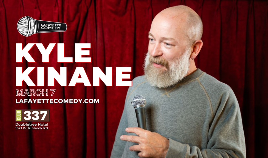 Lafayette Comedy presents KYLE KINANE (as seen on Drunk History, Netflix, Comedy Central) on Saturday, March 7 at Club 337 at 7:00 PM.Doors open at 6:30PMVIP Tickets: $42.00 (plus taxes/fees)General Admission: $32.00 (plus taxes/fees)Kyle Kinane is a comedian from Addison, Illinois. According to Wikipedia, he is a notable person from that town. Other notable residents of Addison have been the boxer Leon Spinks and a woman who wrote poetry about Beanie Babies.Raised in such a cultural fondue pot as this, it was natural for Kyle to find his way from warehouse work into show business. As a comedian, he has been seen on Conan, The Tonight Show, Netflix’s “The Standups,” and three of his own hour-length specials on Comedy Central. As an actor, he’s been in the Judd Apatow series “Love” and truTV’s “Those Who Can’t.” He was also on “Drunk History,” where he unfortunately wasn’t acting.As a voice over actor, he was the former voice of Comedy Central for 8 years and currently plays Bullet on the Netflix series “Paradise PD.” He is also cohost of the Boogie Monster podcast along with Dave Stone, and the streaming show “Hey Girl” with Matt Braunger. As a musician, he has done nothing, as he is not a musician.Kyle’s most recent standup work, “Trampoline In A Ditch,” was recorded at Comedy on State in Madison, Wisconsin and was released on 800 LB Gorilla Records in 2020. The album was accompanied by an animated short, produced by Meister.“When you’re here, you’re family.”