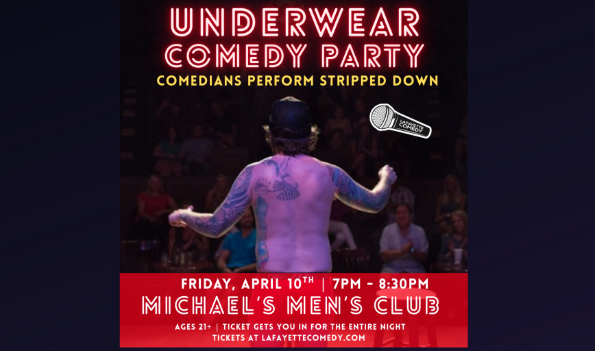 Lafayette Comedy Presents: Underwear Comedy Party - A Standup Comedy Show where Comedians Perform in their Underwear!Michael’s Men's Club | Friday, April 10thTickets: $15 online | $20 cash at the door ($21.26 card/Apple Pay)Ages 21+Showtime: 7:00 PM (Doors open at 6:30 PM) | Ends at 8:30 PMBonus: Comedy show ticket holders can stay for the night!About the Show:"UNDERWEAR COMEDY PARTY" brings together the funniest regional comedians for an unforgettable night of stand-up. Don’t worry—this is a comedy show (yes, your comics will be clothed...but stripped down to their underwear)! Both male and female comedians bare it all!Stick around afterward for great food, drinks, and top-tier entertainment!About Michael’s Men’s Club:The best in Women, Food & Fun since 2001! Whether out for a night of laughs or celebrating in style, Michael’s offers a top-notch experience with great food and a lively atmosphere.Get your tickets now and don’t miss out! #LafayetteComedy #Between2Poles #StandupComedy #LaughsAndGoodTimes
